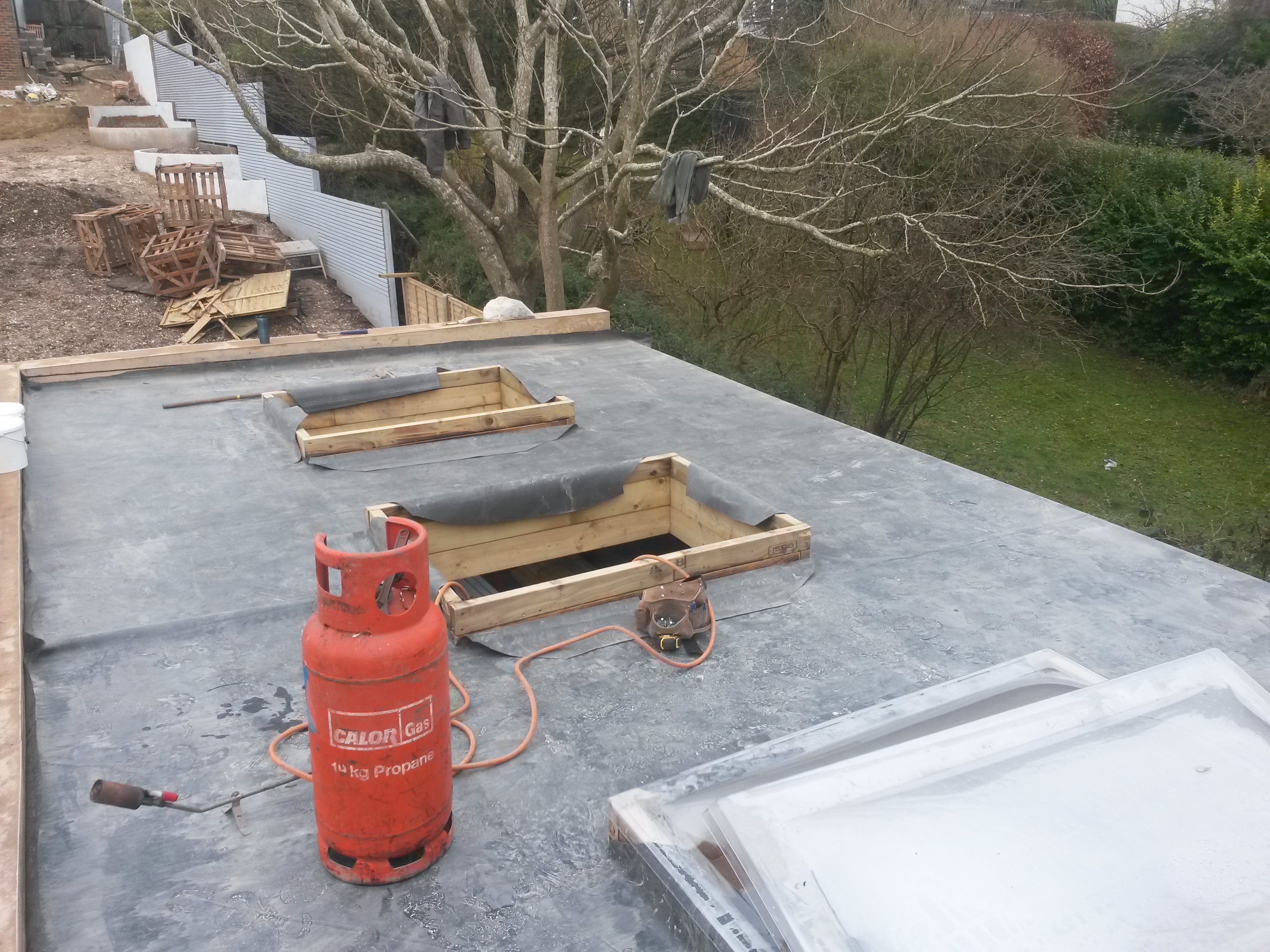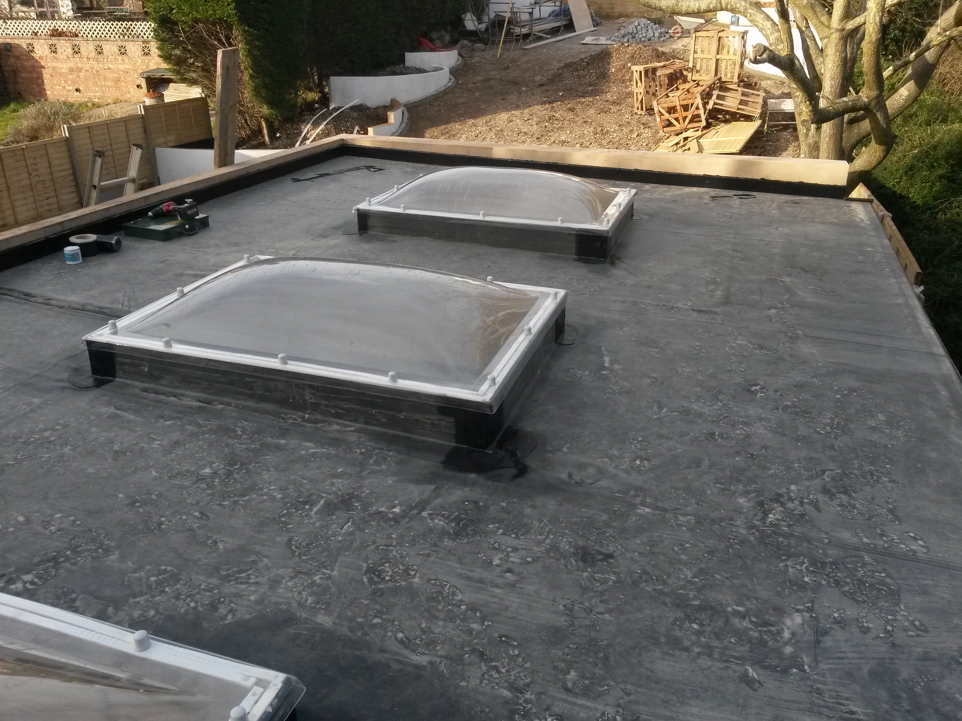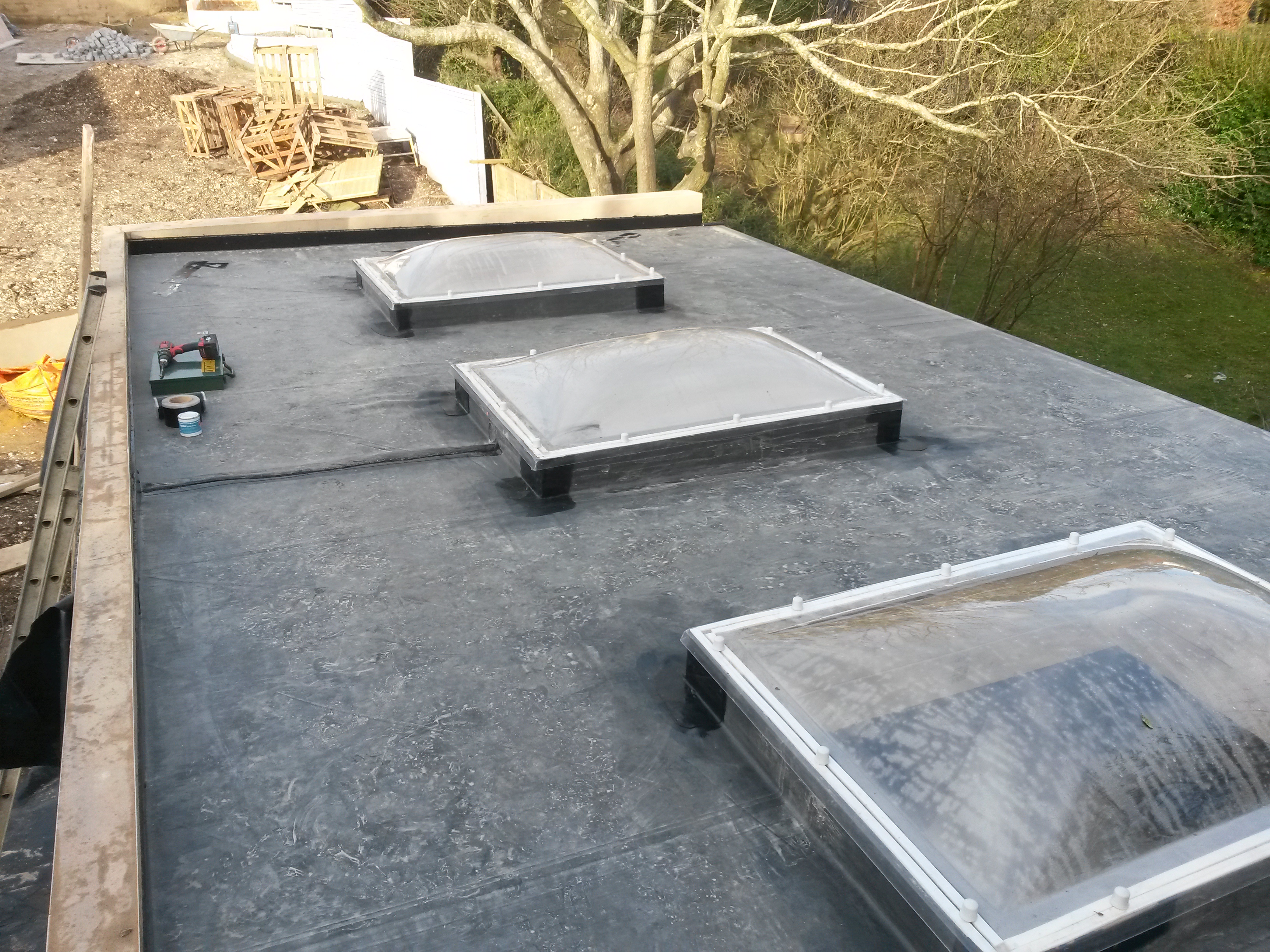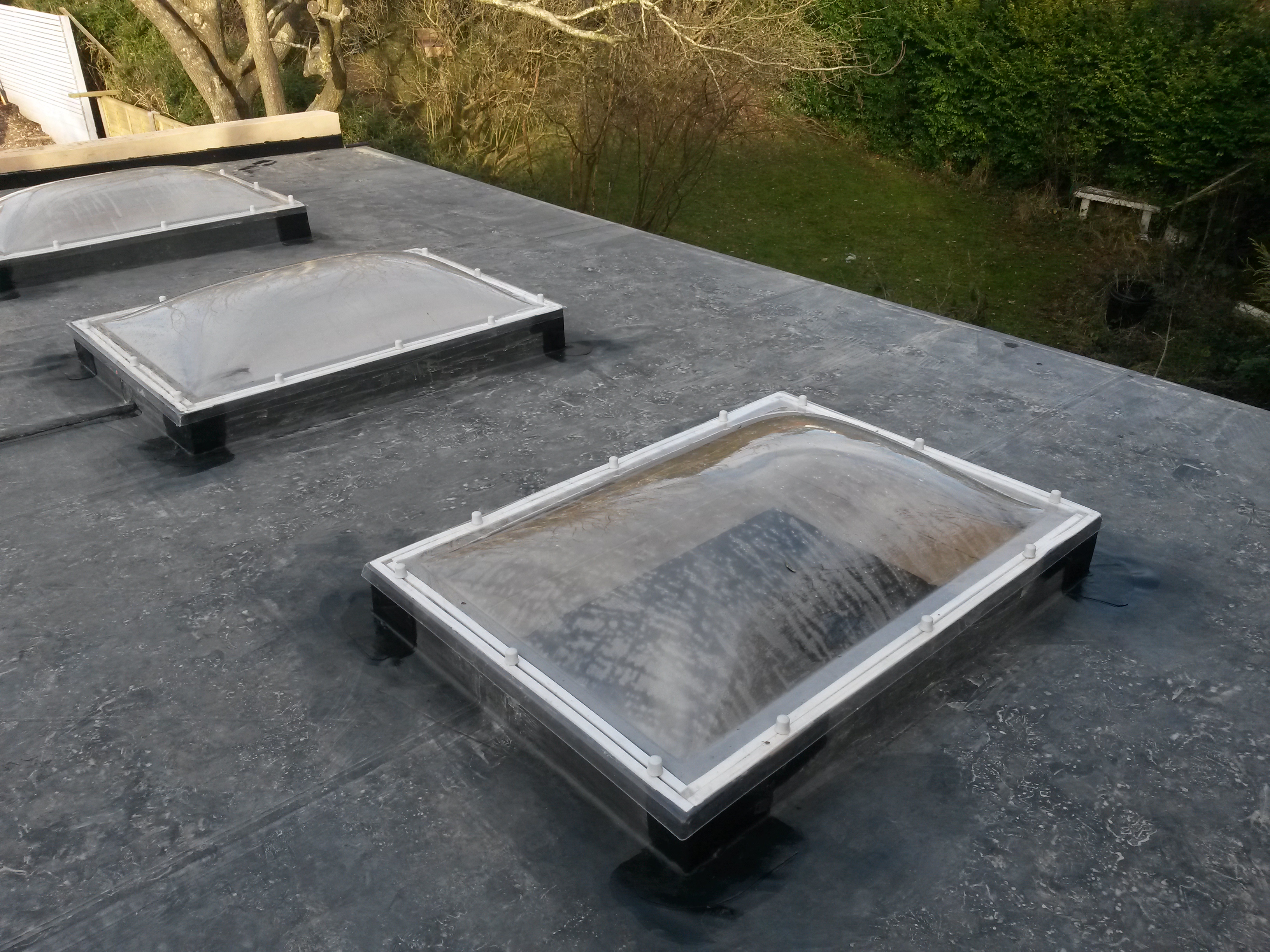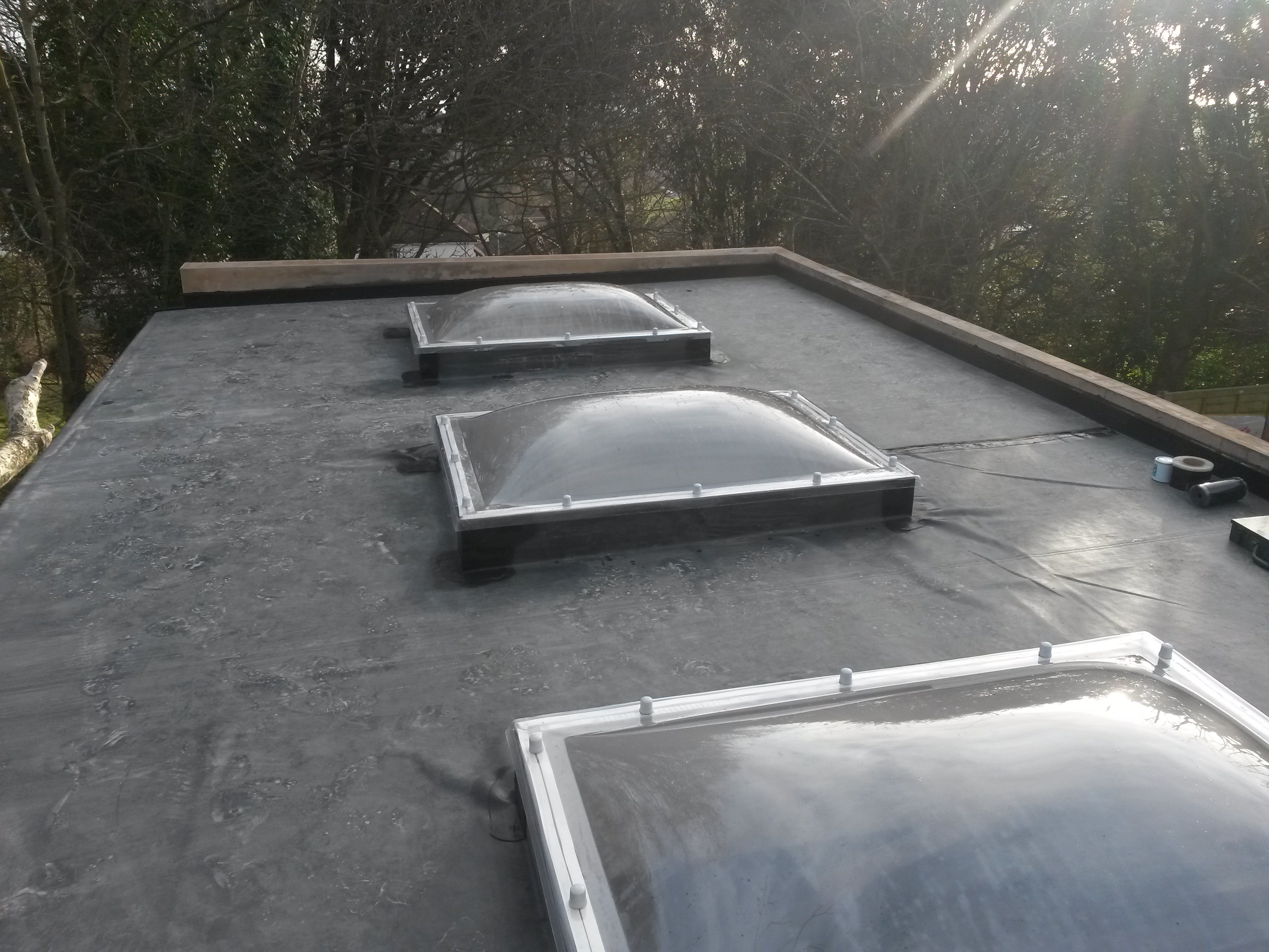 The studio was decked with 18mm OSB3 timber sheet to provide a flat surface to adhere the 1.5mm EPDM rubber membrane. It was made to measure in one piece, and each of the roof openings carefully cut out, to ensure that no joints are in the rubber. The rubber was glued up the upstands of the skylights and the corners were taped with a chemically bonded primer, to vulcanize the rubber together, to become one piece. The domes were installed onto the timber upstands. The parapet wall was chased out and a metal flashing was fixed to the wall to make the roof watertight. A black UPVC clamp trim was fixed to the gutter side of the roof to ensure the water falls into the gutter.